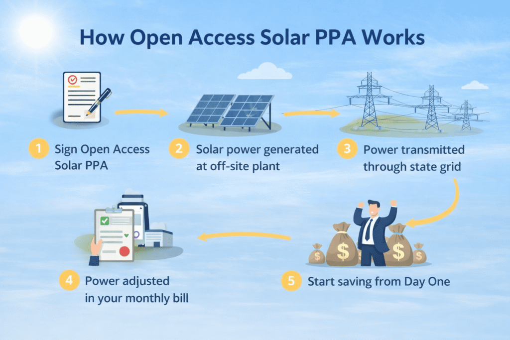 Open Access Solar PPA (Power Purchase Agreement) is a way for businesses to buy solar power directly from a solar plant usually off-site at a fixed, long-term price, using the open access provision of the electricity grid.
